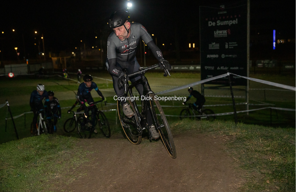 Dik besloot nog naar Almelo af te reizen voor de avondcross. Bij kunstlicht het parcours verkennen was toch wel bijzonder. Hard en snel. Dik had niet de beste start – trapte tweemaal langs zijn pedaal – maar kwam goed in het ritme. Door de temperatuur rond het vriespunt werd het in sommige bochtjes wat glad. Dik gleed een keer weg en daarmee was het vertrouwen wat weg. Hij verloor de aansluiting voor het groepje dat streed om de 10e plek. Een mooie 12e plek kon hij wel verdedigen.